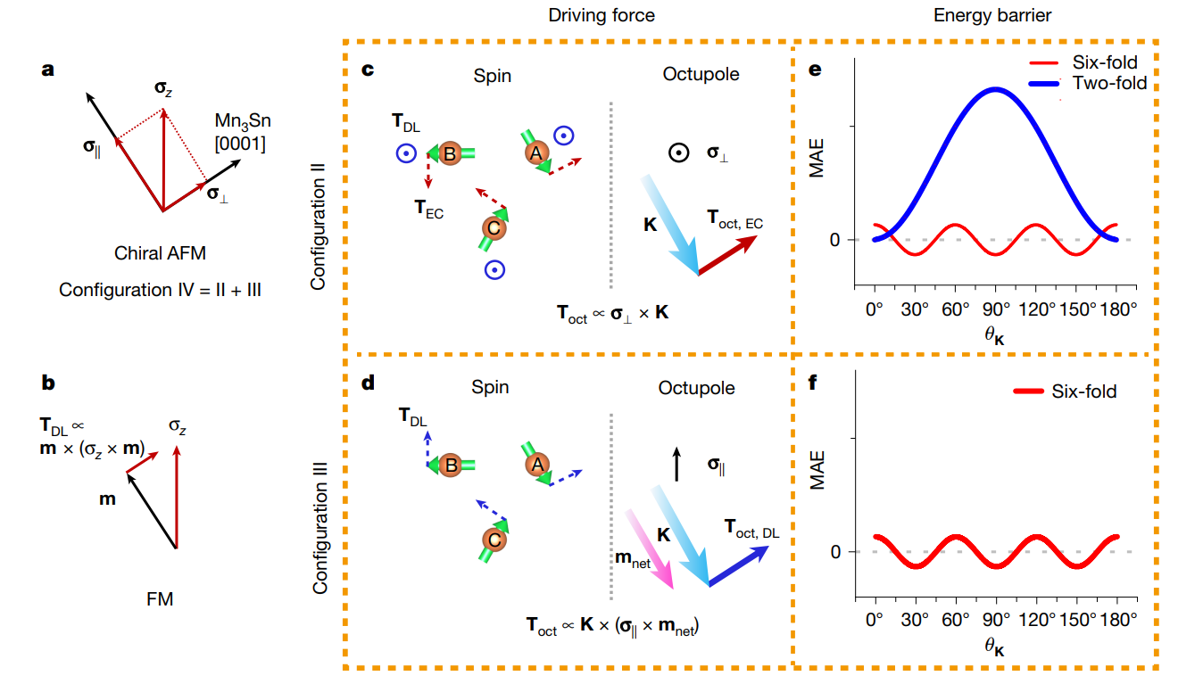 手性反铁磁是磁八极子的载体,这一磁序概念超越了常规的自旋和磁偶极子概念。亚晶格自旋和磁八极子,为理解手性反铁磁的动力学现象提供了两个截然不同的视角。研究团队从磁八极子视角出发,对自旋力矩特征(贡献翻转所需的驱动力)和磁各向异性特征(影响翻转所需克服的能垒)做了系统的理论分析,揭示了两方面关键机制:(1)磁易面约束下,手性反铁磁和铁磁对于面外自旋的响应有本质区别(图2a和b),垂直于磁易面的分量会产生交换耦合力矩(图2c),是高力矩效率的主要来源;而平行于磁易面的分量产生的驱动力(图2d)用以决定零场翻转的极性。手性反铁磁同质结中,面外自旋极化与Kagomé磁易面成倾斜的几何构型,既实现了全电学翻转,又保留了较高的力矩效率;(2)易面所贡献的能垒极低(图2e和f),利于高效翻转,然而却会使手性反铁磁的翻转不完全。而若为了实现100%翻转而引入二重磁各向异性,却会使能垒成数量级地提升,极大限制翻转效率。在传统的构型中,驱动力优势和能垒优势始终无法共存,而倾斜的几何构型(图2a)则成功突破了这一限制,形成了极高的电学翻转效率。